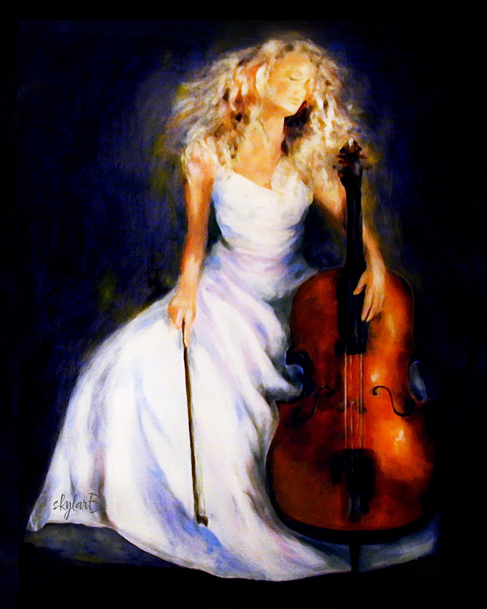 Young Cellist. I was gallery represented at one time. This was sold from a gallery in Palo Alto, California. I received 3 commissions to do similar paintings because of this one. I have done many music themed paintings, typically more rock and roll related. But, I did actually buy a cello once because I loved the sound. I also owned a baby grand piano. I tried. I really did want to have musical talent. It wasn't meant to be.